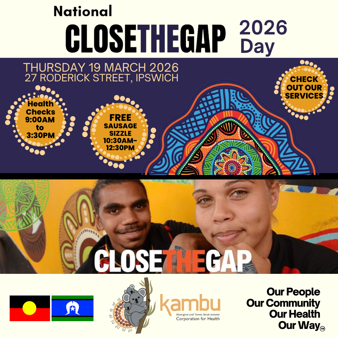 Kambu Health warmly invites our Aboriginal and Torres Strait Islander community to come together for Close the Gap Day at our Ipswich Clinic on Thursday 19 March 2026.
