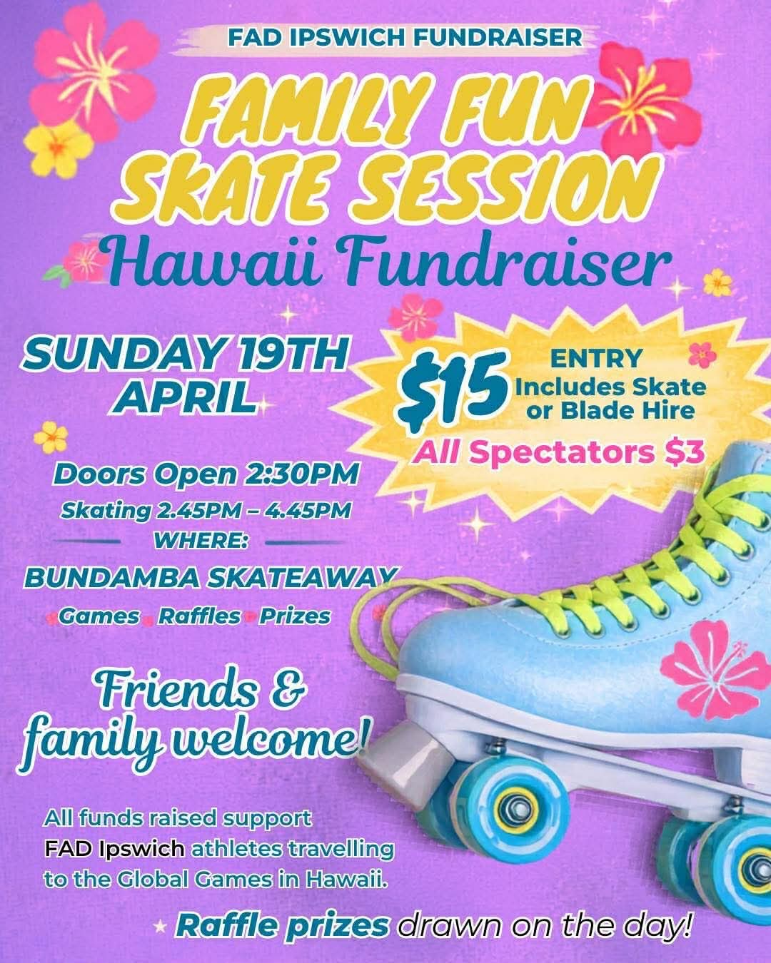 Hi everyone fad ipswich is doing a skateaway fundraiser on the 19th to raise funds for our athletes to compete and perform in hawaii at the global D&C games our team would love to see you put on your skates or blades and enjoy a awesome day out