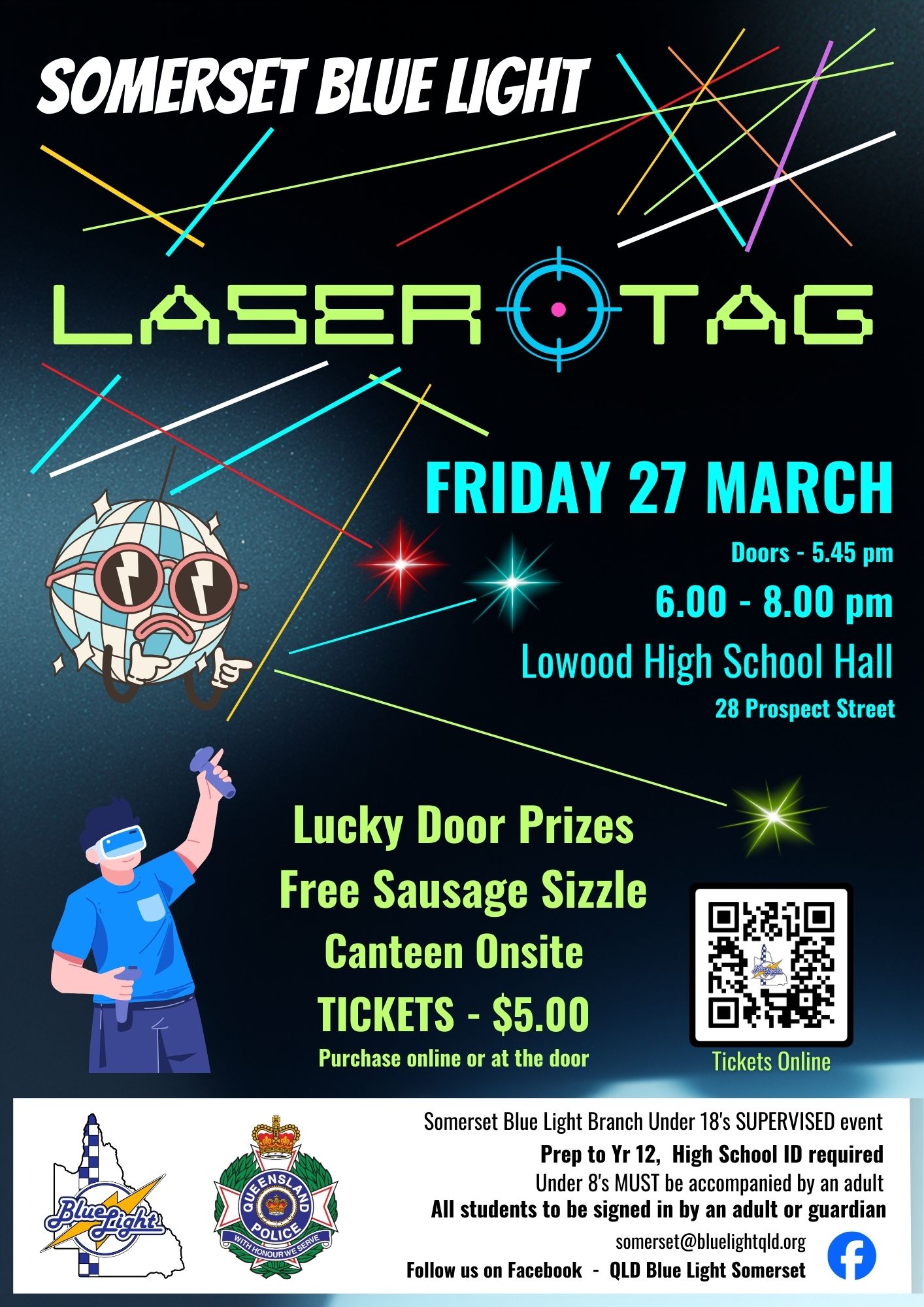 Somerset Blue Light is more than just discos — we’re bringing you LASER TAG! Join us for an action-packed night where kids can team up and enjoy some friendly competition with their friends. Teams of five will be organised on the night to ensure children are grouped with others of similar age and ability. Please note: Consent forms will need to be signed before children can participate. For more information, contact somerset@bluelightqld.org or check out our Facebook Page: Qld Blue Light Somerset