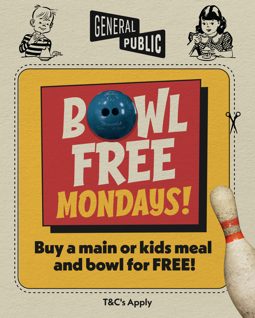 🎉 Start your Mondays off right! Get a FREE game of bowling at all GP Venues when you purchase any main or kids’ meal. 🍔🎳