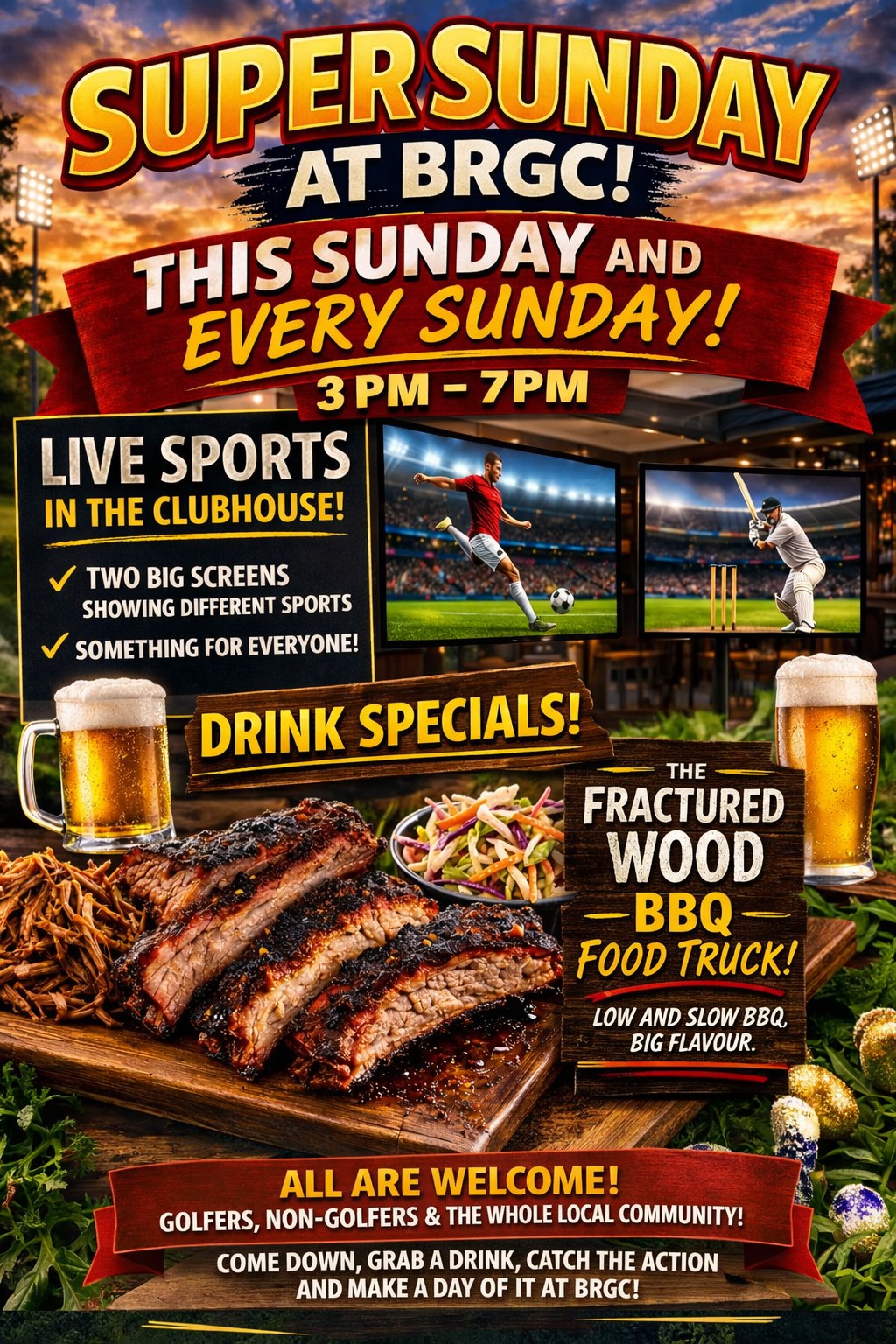 From 3pm every Sunday, the clubhouse comes alive with live sport on the big screens (AFL, NFL and more), drink specials, and great food from local favourite Fractured Wood BBQ Australia.
