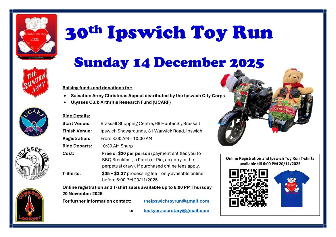 For further information contact: theipswichtoyrun@gmail.com or lockyer.secretary@gmail.com